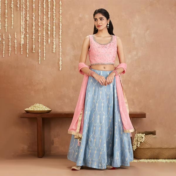 Look as gorgeous as ever wearing this Bani pink crop top and a skirt with dupatta from Gajra Gang at the next soiree! Crafted from polyester with beautiful embroidery, this set is sure to instantly become your forever favourite. Pair it with jhumkas and heels and dance your way to the upcoming gala.